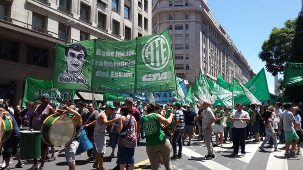 Trabajadores estatales nucleados en la Asociación de Trabajadores del Estado (ATE), junto a sectores de la CTA y de movimientos sociales, comenzaron a marchar desde las 11.30 desde la zona del Congreso hacia Plaza de Mayo, en el marco de un paro general de actividades en demanda de la reincorporación de los despidos en los últimos meses, por el adelantamiento de la apertura de la paritaria nacional y contra la precariedad laboral.