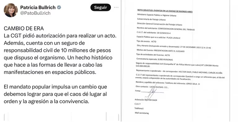Al mismo tiempo, desde la cartera que lidera Bullrich, se indicó: “Tras la revisión y otorgamiento de la autorización a Héctor Daer, para el evento denominado ‘CGT’ en el espacio público de Plaza Lavalle, se destaca a su vez que se cuenta con un seguro de responsabilidad civil de 10 millones de pesos, dispuesto por el organismo”.