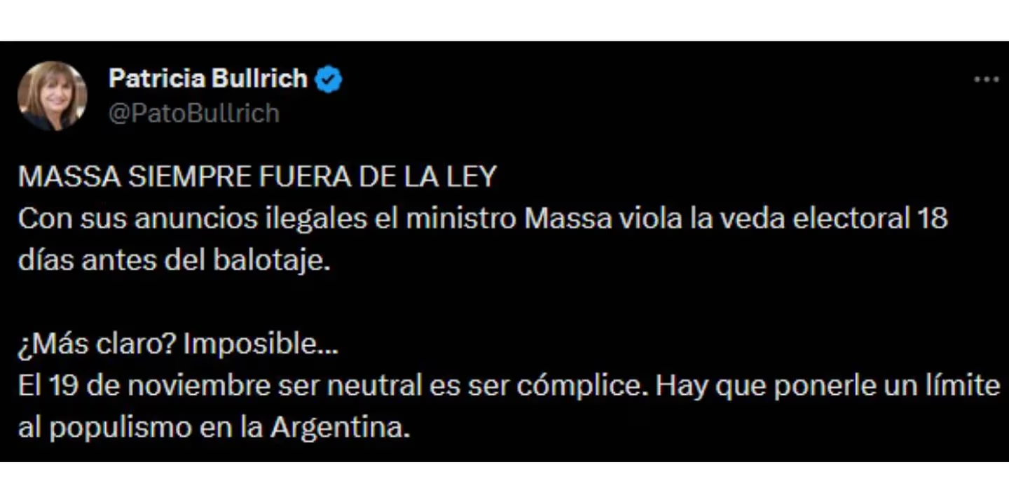 Tras esto, la ex candidata a presidenta indicó desde su cuenta de Twitter que el acto sería violatorio de la veda electoral que rige sobre el funcionario: “Massa siempre fuera de la ley. Con sus anuncios ilegales el ministro viola la veda electoral 18 días antes del balotaje. ¿Más claro? Imposible”. Y reiteró su llamado a votar a Javier Milei en la segunda vuelta: “El 19 de noviembre, ser neutral es ser cómplice. Hay que ponerle un límite al populismo en la Argentina”.
