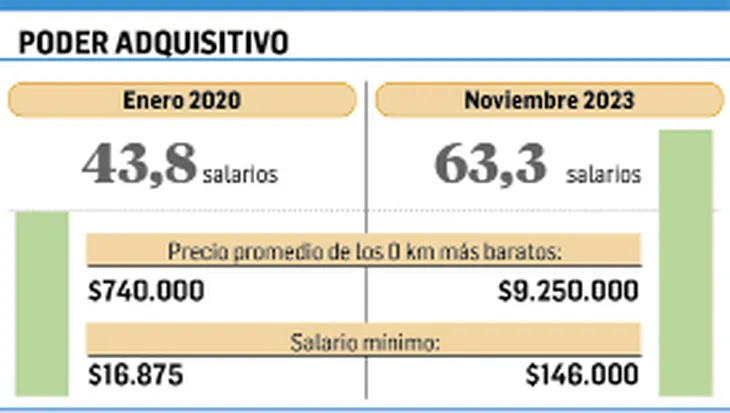 El salario mínimo en noviembre es de $146.000. Tomando un valor promedio hoy, entre $9.000.000 y $9.500.000, de los modelos más accesibles, hacen falta 63,3 sueldos para comprar alguno de los autos más baratos.