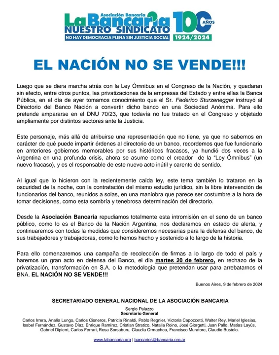 «Hoy tomamos conocimiento que Federico Sturzenegger instruyó al Directorio del BNA a convertir al Banco Nacion en una SA amparándose en un DNU que todavía no fue tratado por el Congreso y que ya fue objetado por la Justicia«, señala el comunicado de La Bancaria.