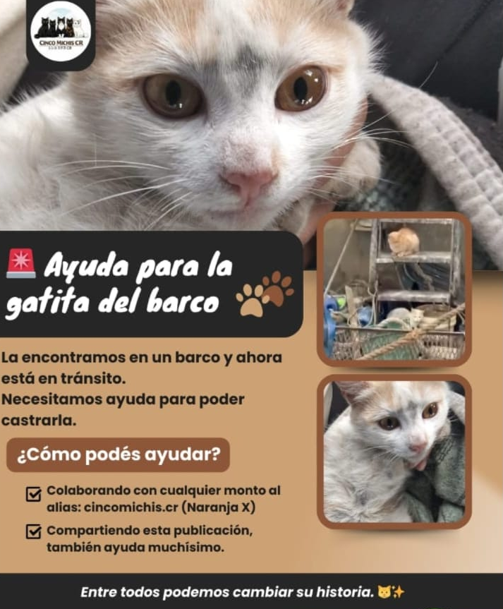 La organización Cinco Michis CR pide colaboración para esterilizar a una gatita embarazada que llegó a Comodoro Rivadavia a bordo de un barco pesquero desde San Antonio Oeste.