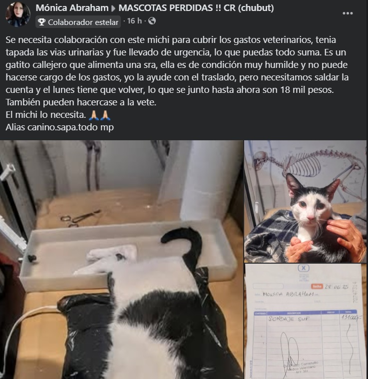 Una vecina de la ciudad está pidiendo colaboración para ayudar a un gatito callejero que fue llevado de urgencia a una veterinaria tras presentar una obstrucción en las vías urinarias. El felino, de pelaje negro con blanco, es alimentado diariamente por una señora de condición humilde que, aunque se ocupa de cuidarlo, no puede afrontar los gastos veterinarios.