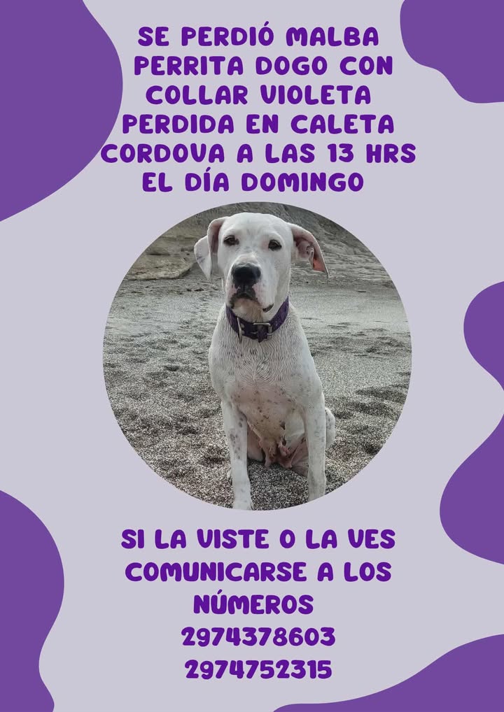 La familia de Malba busca a su perra Dogo, que se perdió este domingo alrededor de las 13 horas, luego de asustarse por la pirotecnia utilizada en la cancha del barrio Caleta Córdova.
