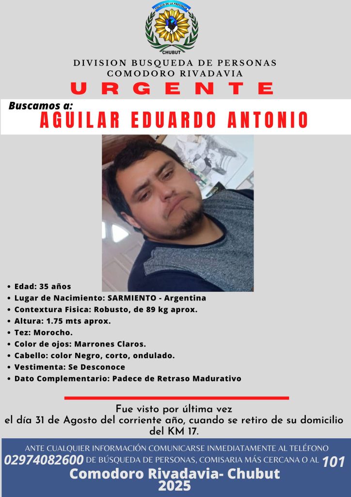 La División Búsqueda de Personas de Comodoro Rivadavia lanzó un pedido de colaboración a la comunidad para dar con el paradero de Eduardo Antonio Aguilar, de 35 años, quien fue visto por última vez el pasado 31 de agosto de 2025 en inmediaciones de kilómetro 17.