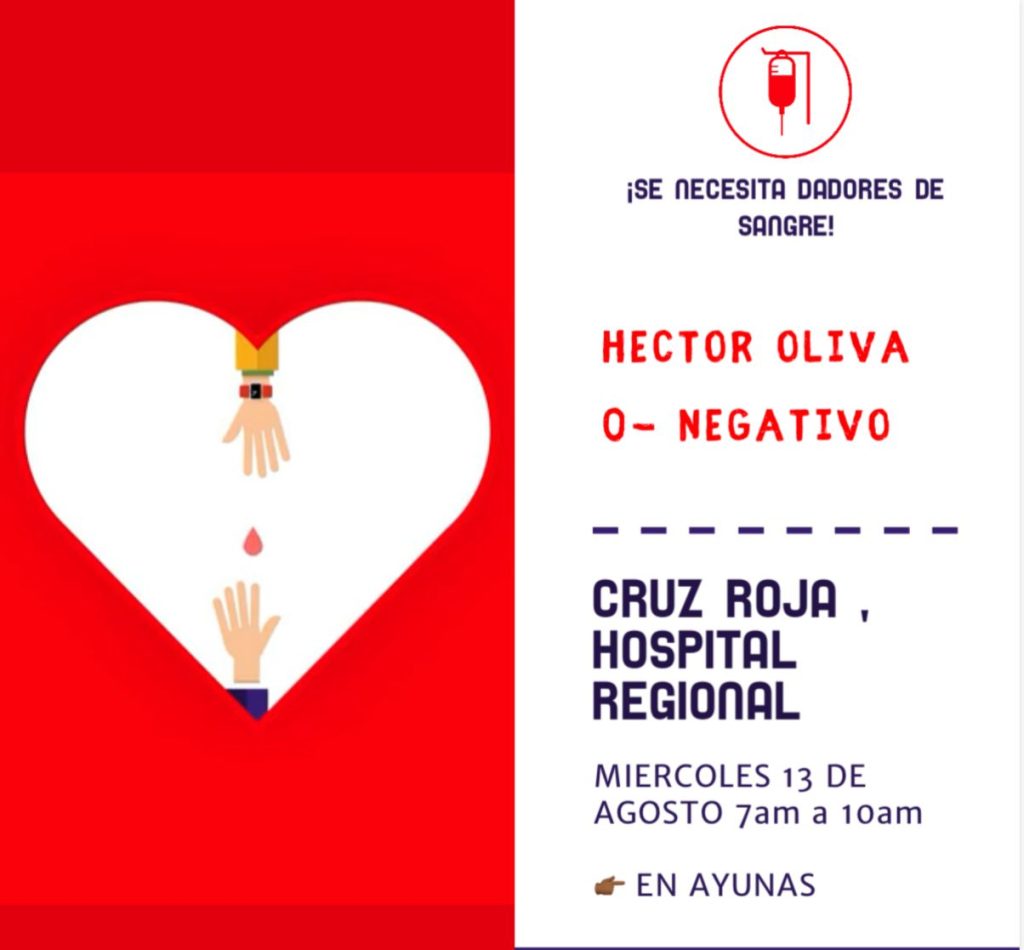 La donación puede realizarse este miércoles 13 de agosto, de 7:00 a 10:00 horas, en la Cruz Roja del Hospital Regional. Es fundamental que quienes se acerquen a donar informen que lo hacen en nombre de Héctor Oliva.