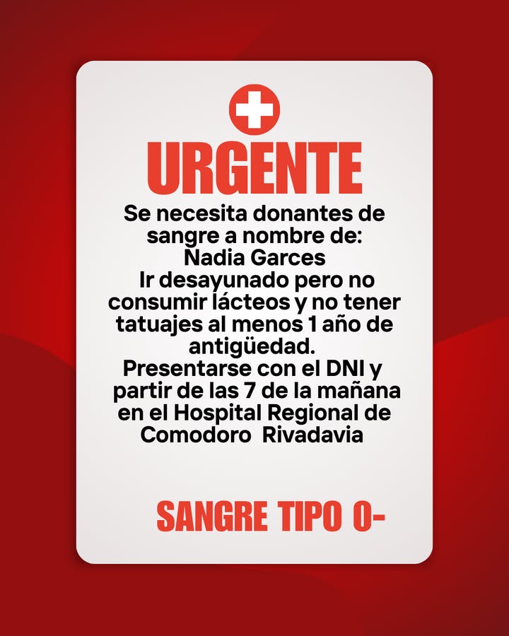 Familiares de Nadia Garcés convocan a donantes de sangre tipo O- ante una necesidad urgente en el Hospital Regional.