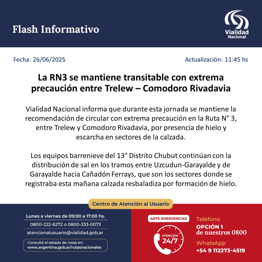 Este mediodía, el estado de rutas se reforzó con un flash informativo con pedido de extrema precaución al transitar sobre Ruta Nacional N° 3 en el tramo que une al Valle de la provincia con Comodoro Rivadavia.