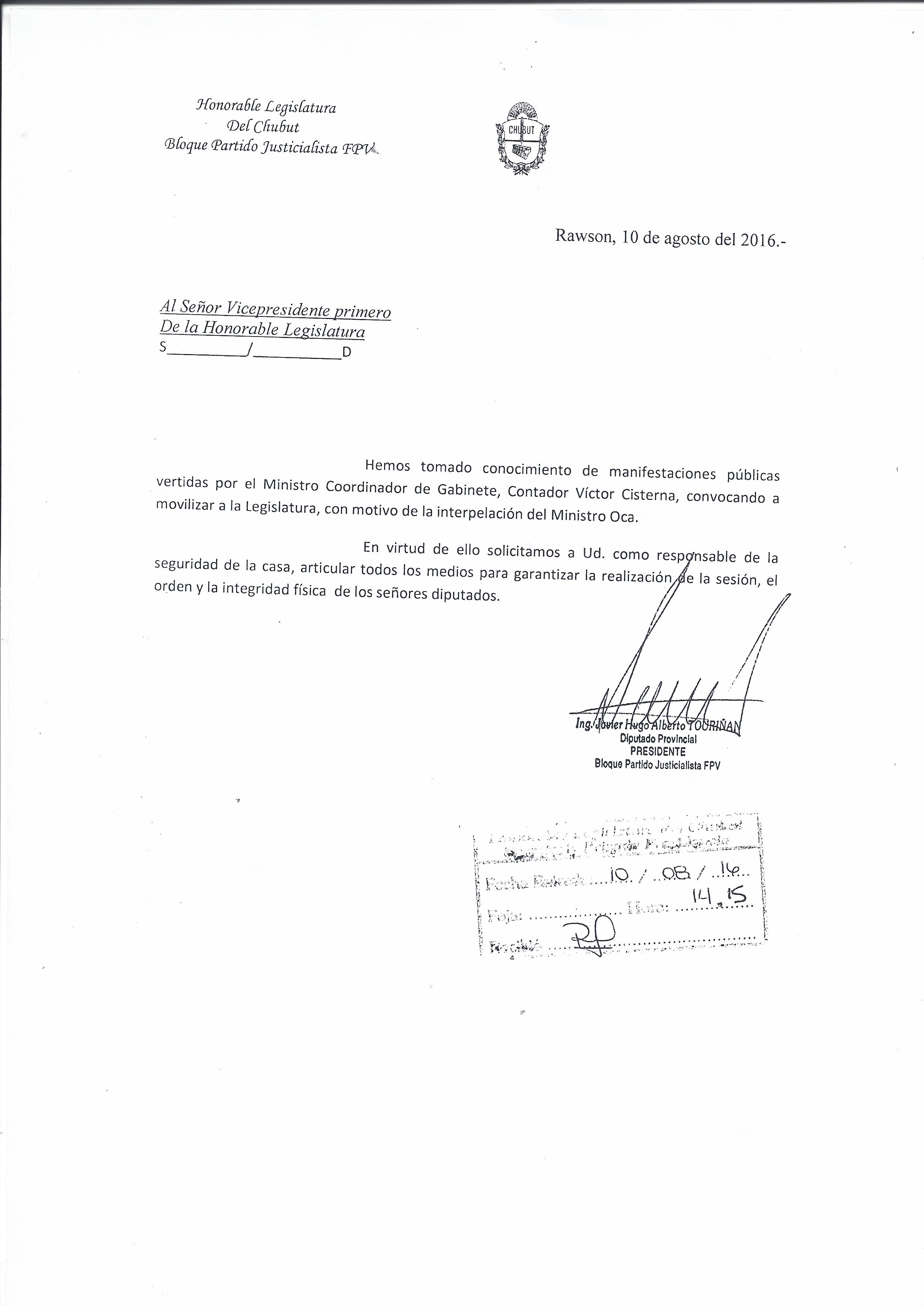 Pasadas las 14 horas se presentó ante la Secretaría Privada de Presidencia de la Honorable Legislatura del Chubut, una nota solicitando se articulen todos los medios para garantizar la realización de la sesión, el orden y la integridad física de los señores diputados, que llevarán adelante este jueves la interpelación al Ministro de Economía, Pablo Oca.