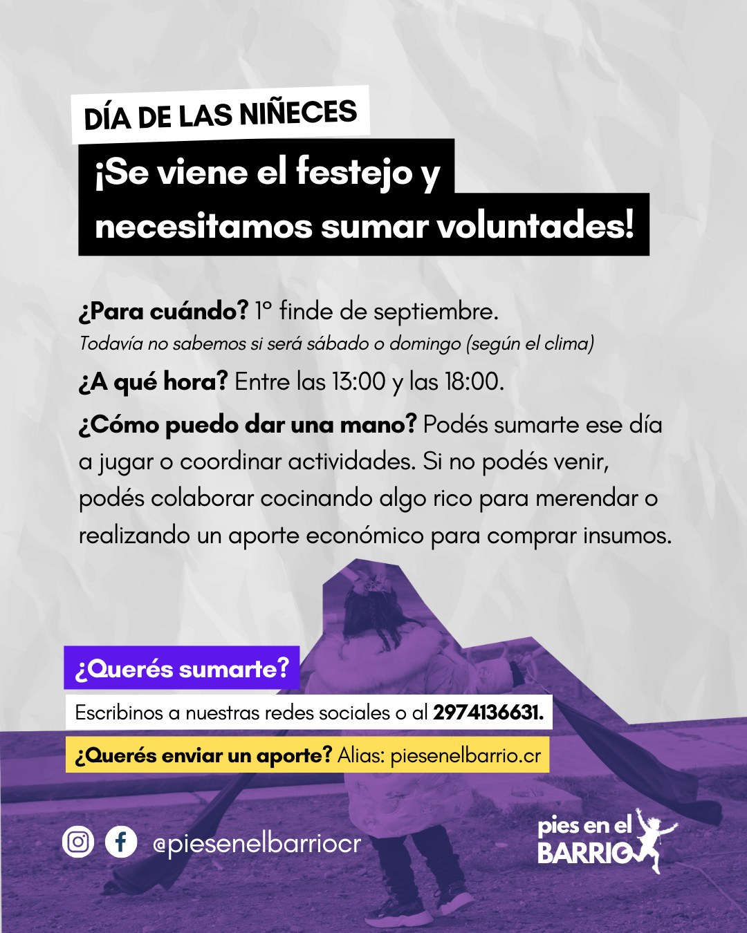 El primer fin de semana de septiembre se avecina con una propuesta llena de alegría y sentido comunitario: el festejo del Día del Niño organizado por la agrupación Pies en el Barrio. Como cada año, esta celebración busca convertirse en una jornada inolvidable para todas las niñas y niños del barrio, y para lograrlo necesitan sumar manos, corazones y voluntades.