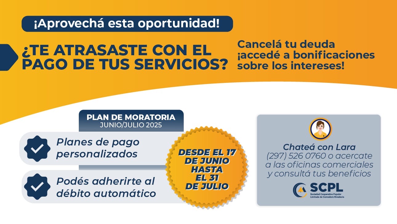 Para más información sobre el Plan de Moratorio junio/julio 2025, comunicarse con la asistente virtual Lara por WhatsApp al (297) 526 0760 o acercarse a las oficinas comerciales de sede Central en San Martín 1641, Km. 8 en Alférez Vázquez 749 y Rada Tilly en Juan Guteff 2075, de lunes a viernes en el horario de 08 a 15 horas.