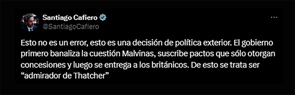 “Esto no es un error, esto es una decisión de política exterior. El gobierno primero banaliza la cuestión Malvinas, suscribe pactos que sólo otorgan concesiones y luego se entrega a los británicos. De esto se trata ser “‘admirador de Thatcher’”, expresó Santiago Cafiero, quien ocupó el cargo de canciller durante el gobierno de Alberto Fernández.