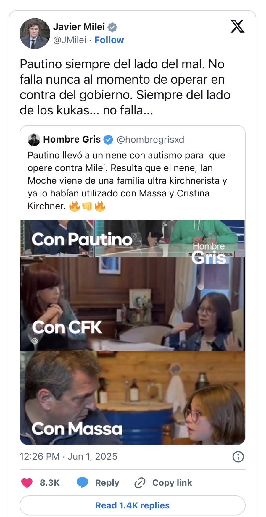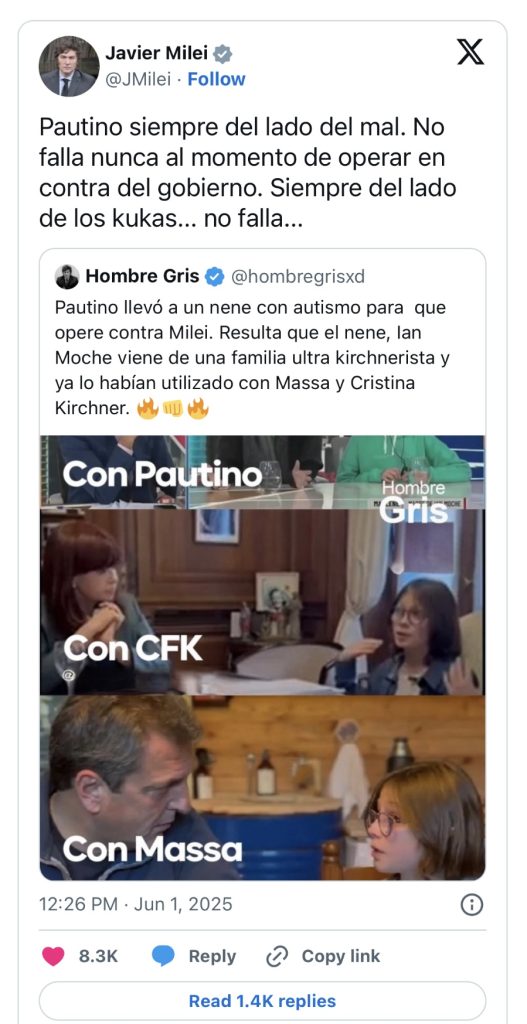 El mandatario apuntó directamente contra Ian Moche, un niño de 12 años con autismo que desde hace tiempo reclama junto a su familia una Ley de Discapacidad más inclusiva y políticas públicas concretas. “Operan contra el Gobierno”, escribió Milei, en un mensaje que fue interpretado como una deslegitimación del reclamo del menor y su entorno.