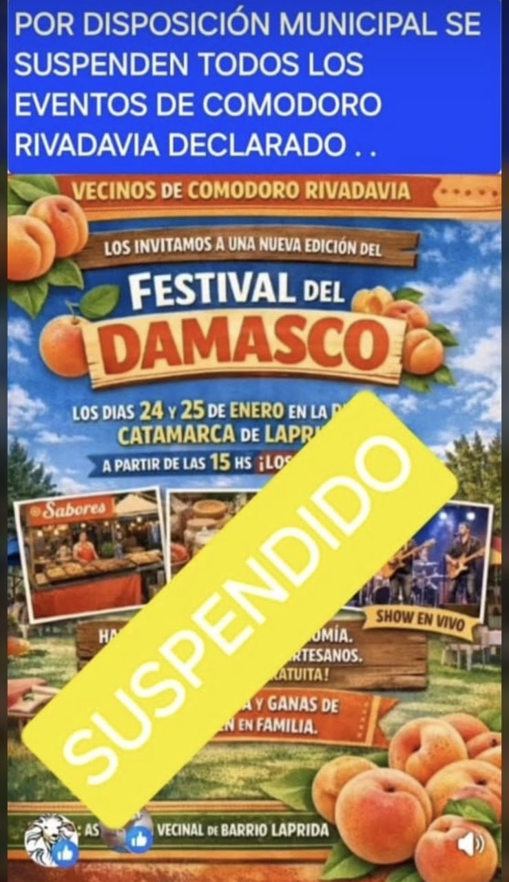 La Municipalidad de Comodoro Rivadavia, dispuso la suspensión del Festival del Damasco ante los hechos de público conocimiento en Km 3 en el sector del Cerro Hermitte.