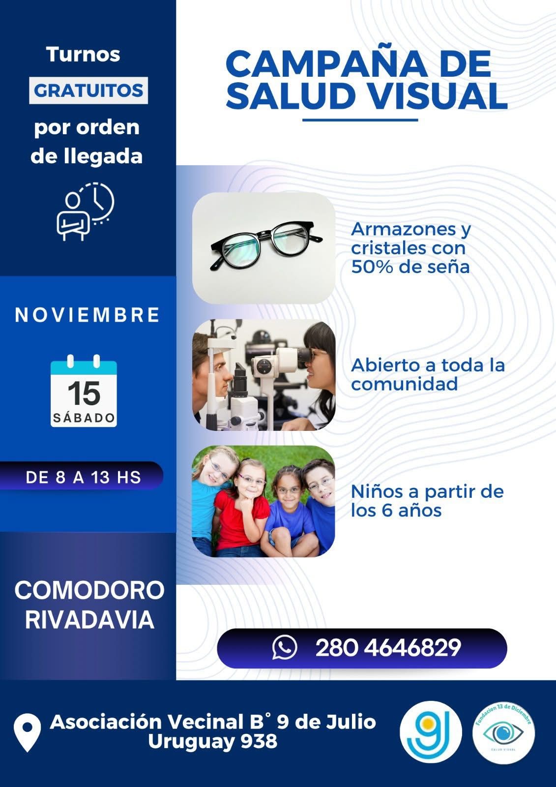 Este sábado 15 de noviembre continuará la campaña de salud visual en la sede de la Asociación Vecinal del barrio 9 de julio, ubicada en Uruguay 938, en Comodoro Rivadavia.
