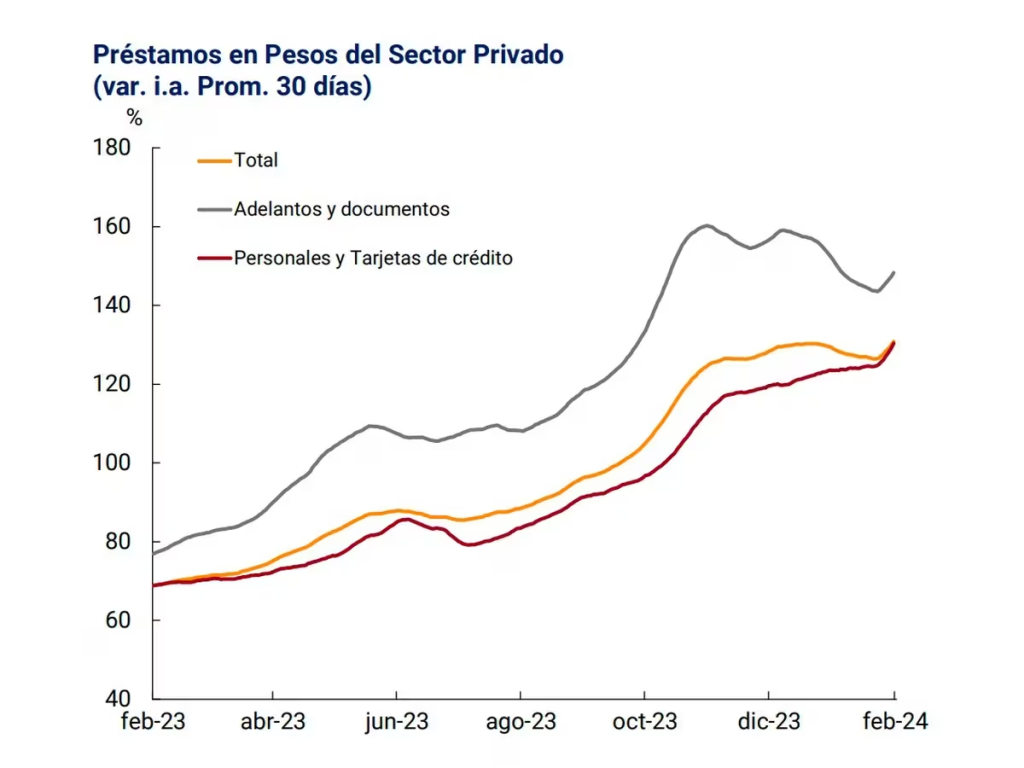 En cuanto a los préstamos al sector privado, el total alcanzó el mes pasado un nivel de $17,3 billones, representando una suba en los últimos 365 días de $10,1 billones, equivalente al 138,9% anual, valores que se encuentran muy por debajo de la inflación del período, si consideran los últimos doce meses. Si bien el Indec dará a conocer este miércoles el dato de inflación, según las previsiones de privados, el IPC creció alrededor de un 250% en el último año.