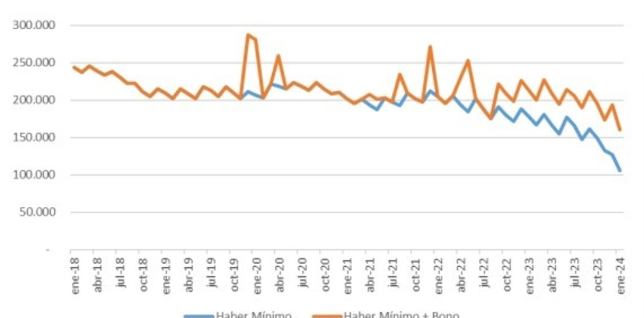 Si bien durante el primer mes del año el gasto decrece en términos reales respecto de diciembre, cuando está el pago de aguinaldos, la licuación de los haberes obedeció a que en el último mes del 2023 aumentaron por debajo de la inflación debido a la fórmula de movilidad (que sigue salarios y recaudación) y a que el gobierno no otorgó en enero un refuerzo de emergencia más allá del bono.