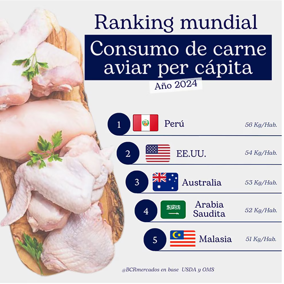 A nivel mundial, Argentina se encuentra en sexto lugar en el ranking de consumo promedio per cápita de carne aviar. El primer puesto lo ocupa Perú, con un consumo de 56,4 kg por habitante; en segundo lugar, Estados Unidos con 53,6 kg. /h.; y en tercer lugar Australia, con 53,4 kg. por habitante en el año 2024.