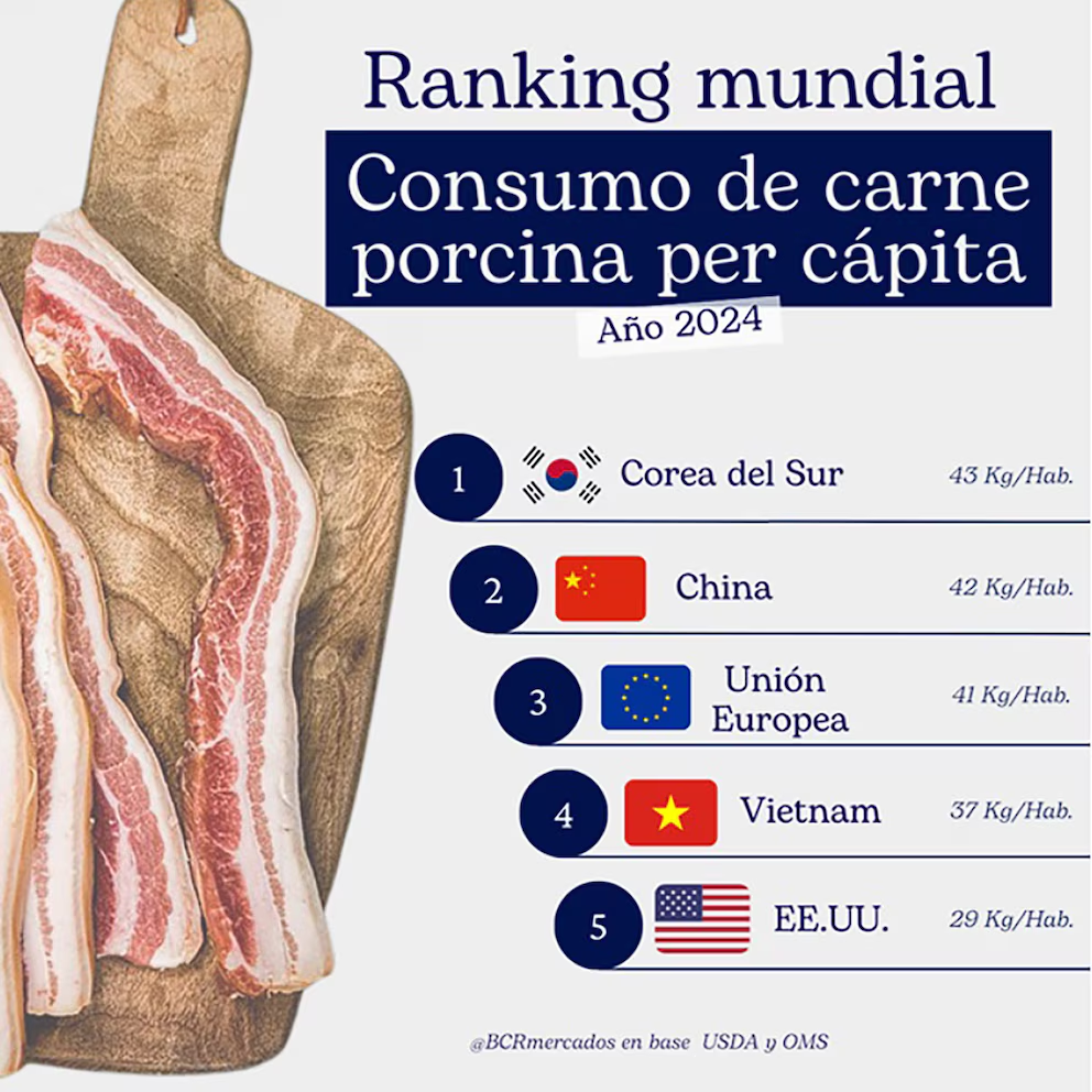 Según detallaron desde la BCR, los tres territorios de mayor consumo promedio per cápita habrían sido, en primer lugar, Corea del Sur, con 42,7 kg. por habitante; en segundo lugar, China, con un promedio general de 42 kg. por persona; y, en tercer lugar, la Unión Europea con un promedio de 40,89 kg. por habitante consumidos en el año 2024.