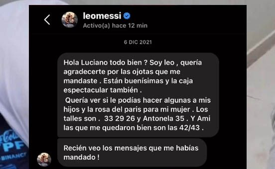 “Hola Luciano todo bien? Soy Leo, quería agradecerte por las ojotas que me mandaste” inició diciendo Messi en el chat con el creador de las ojotas del momento.