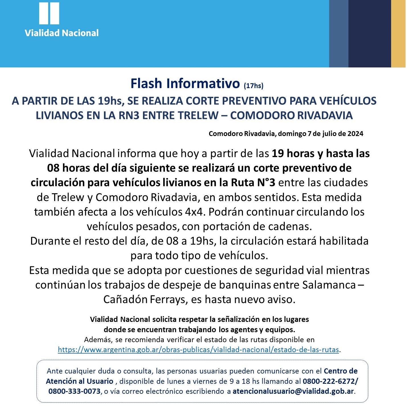 “La RN3 se corta para el tránsito liviano a las 19 hs y se vuelve a habilitar a las 08 de la mañana. Esta modalidad estará vigente por una semana aproximadamente”, concluyó finalmente Retamal.