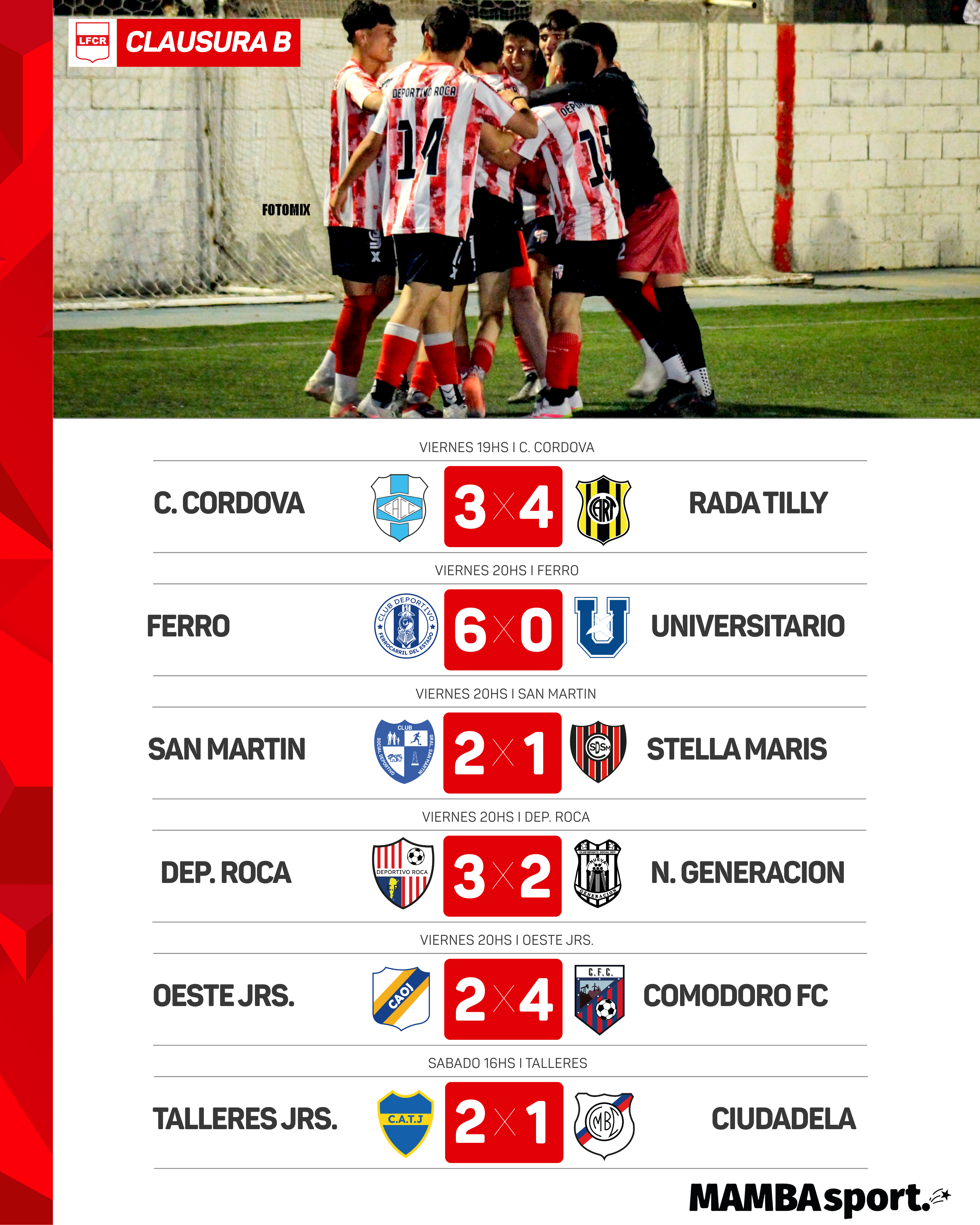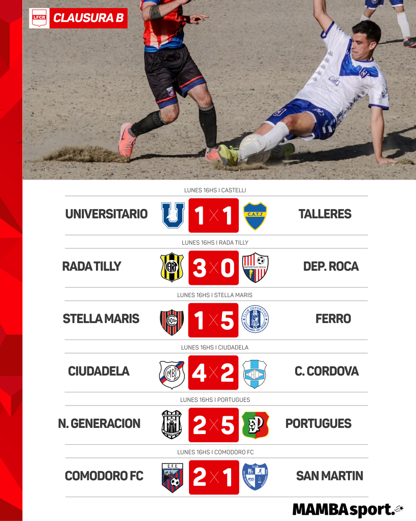 Ferro no afloja: este fin de semana hizo 11 goles repartidos entre Universitario (6 a 0) y Stella Maris (5 a 1). Está a dos puntos de Portugués en el Clausura y a 3 del líder Rada Tilly. Si quiere ascender, necesita ganar el torneo.
