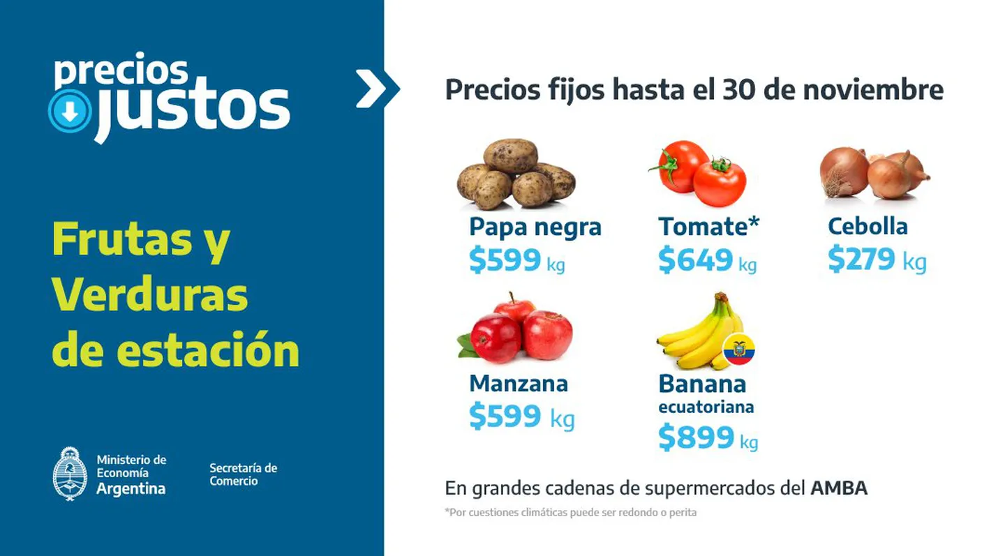 La Secretaría de Comercio renovó el acuerdo de la canasta de frutas y verduras de estación a precios fijos hasta el 30 de noviembre. La medida forma parte de Precios Justos, una de las herramientas con las que el Gobierno busca contener la inflación de los alimentos, el rubro de mayor incidencia en todos los sectores, especialmente los más relegados, indica TN.