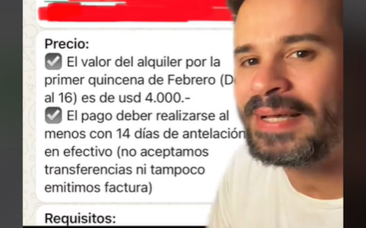 Sin embargo, la mayor sorpresa llegó cuando le comentó sobre el precio y los requisitos que pedía para su estadía en el complejo. “El valor del alquiler por la primera quincena de febrero es de US$4.000. El pago debe realizarse al menos con 14 días de antelación en efectivo (no aceptamos transferencia ni tampoco emitimos facturas”, especificó.