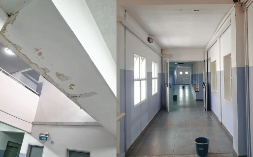 Las goteras también se extienden a todo el ala nueva de la escuela, especialmente en el pasillo de la planta alta, donde la mayoría de los techos no cuentan con cielo raso y se encuentran las luminarias del establecimiento.