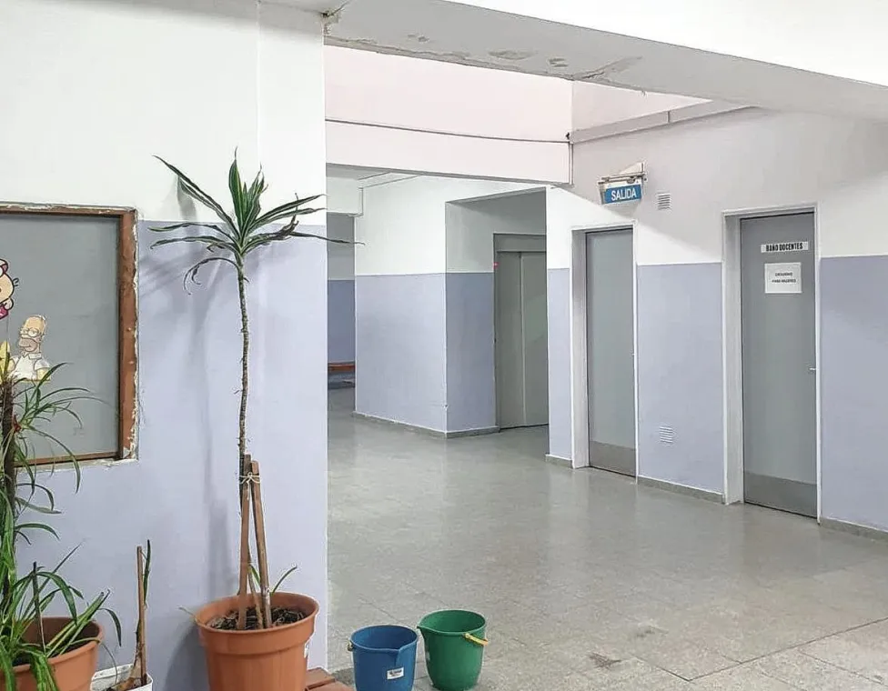 Las intensas lluvias de los últimos días provocaron goteras en la preceptoría, tanto en la planta alta como en la planta baja. Una viga que marca la división entre el edificio original y la última ampliación presenta filtraciones constantes, un problema que arrastra desde el año pasado sin una reparación definitiva.