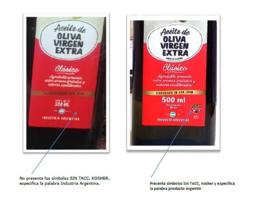 El envase apócrifo, que declara ser elaborado y fraccionado por «San Juan de los Olivos» (RNE 18-002065) para «Agro Aceitunera S.A.» en Aimogasta, La Rioja, presenta diferencias visuales determinantes respecto al original. La botella falsificada carece de los símbolos de «Sin TACC» y de la certificación «Kosher», elementos distintivos de la marca. Asimismo, en el rotulado ilegítimo se lee la leyenda «Industria Argentina», a diferencia del original que especifica «Producto Argentino».