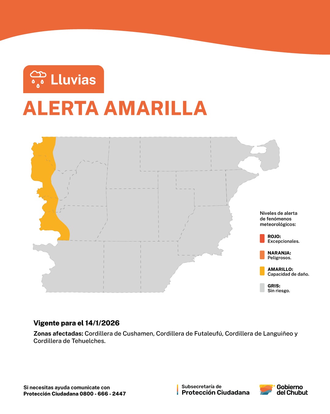 El Servicio Meteorológico emitió una alerta amarilla por lluvias que estará vigente este miércoles 14 de enero, y que afectará a distintos sectores de la cordillera de Chubut, una noticia que trae alivio en el contexto de los incendios forestales que se registran en la región.