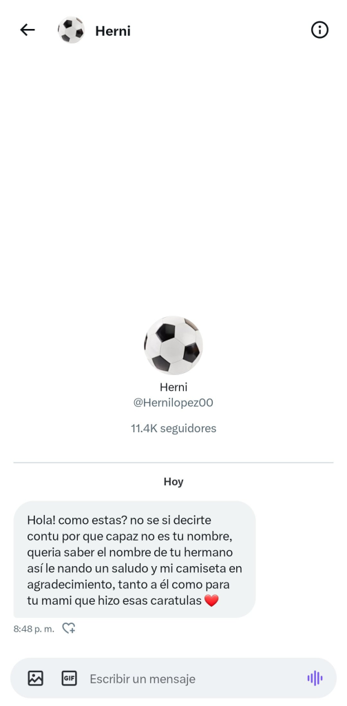 “Quería saber el nombre de tu hermano así le mando un saludo y mi camiseta en agradecimiento, tanto a él como a tu mami que hizo esas carátulas”, dijo el jugador.