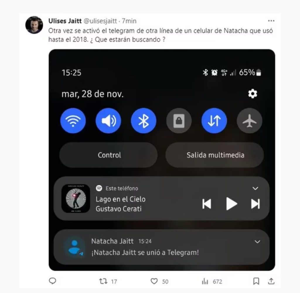 Este martes, Ulises compartió una captura de pantalla de su celular en el que se veía la notificación de un servicio de mensajería: “¡Natacha Jaitt se unió a Telegram!”.