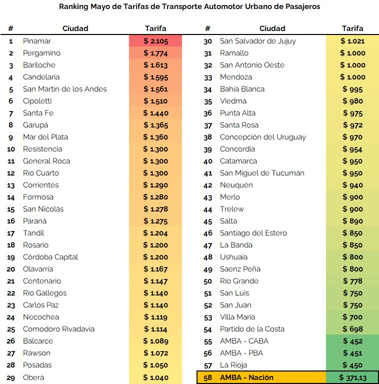 El boleto más caro se registra en Pinamar, con un valor de $2.105, mientras que en el Área Metropolitana de Buenos Aires (AMBA) y La Rioja los precios son considerablemente más bajos, con tarifas inferiores a $500.