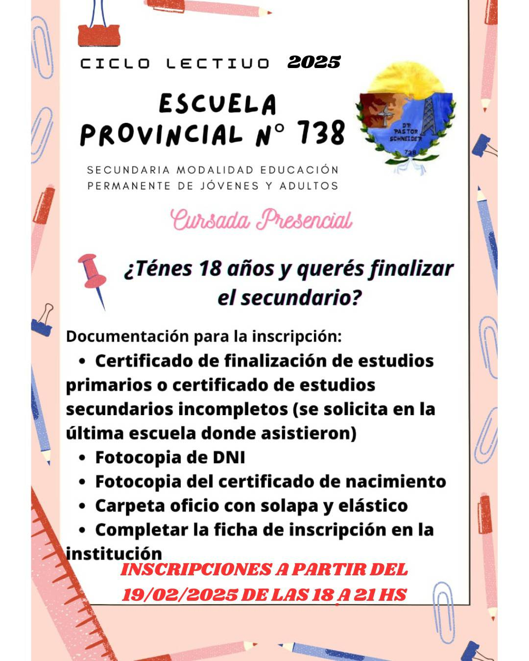 La Escuela N° 738 “Dr. Pastor Schneider”, que ofrece educación secundaria bajo la modalidad de Educación Permanente para Jóvenes y Adultos (EPJA), anunció la apertura de inscripciones para el Ciclo Lectivo 2025. La propuesta está dirigida a personas mayores de 18 años que quieran completar sus estudios secundarios en modalidad presencial.