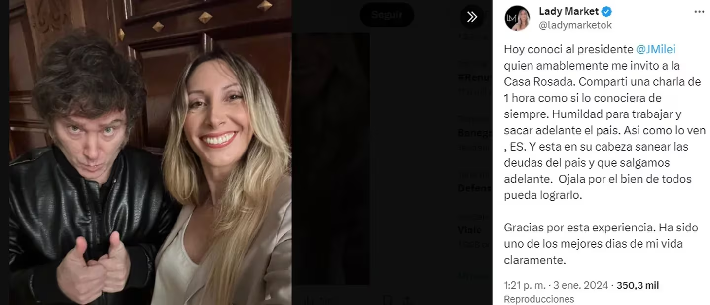 Entre las repercusiones que generó el encuentro, había críticas a Milei por recibir a “una twittera” a lo que Lady Market respondió que también es arquitecta. Y remarcó: “Para los que creen que están boludeando, les aviso que no van ni por el 40% de todo lo que se viene. Así que relajen que el Presidente trabaja más que todos nosotros juntos”.