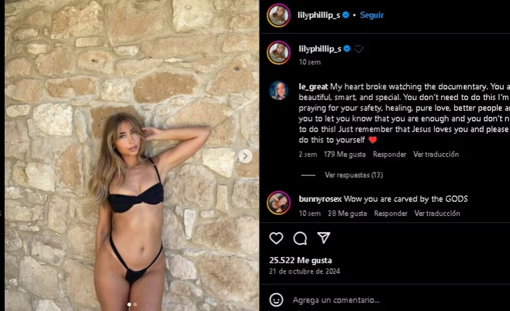 Además, Lily Phillips es una influencer que cuenta con más de 655 mil seguidores en Instagram, red social que utiliza para publicar historias de su vida diaria, así como para promocionar sus fotos y videos exclusivos.