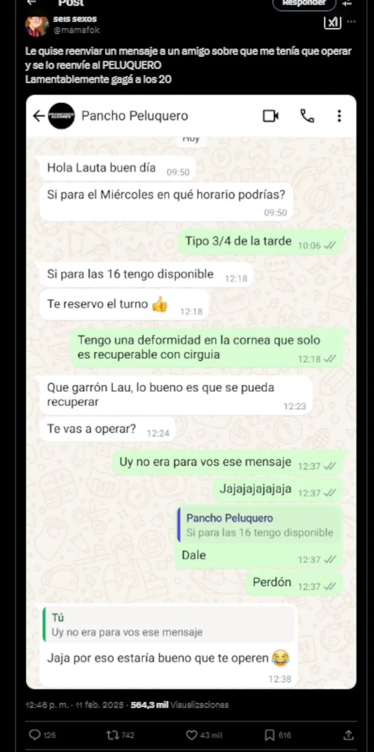 “Le quise reenviar un mensaje a un amigo sobre que me tenía que operar y se lo reenvíe al peluquero”, escribió el chico en el tuit que se viralizó, donde además publicó la captura de pantalla de la conversación que había tenido por WhatsApp.