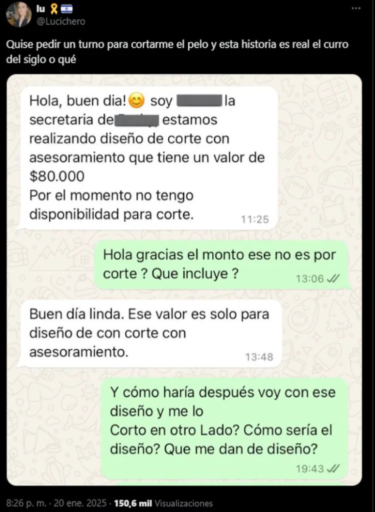 Como primer mensaje se puede ver que la secretaria del lugar le escribió algo inesperado: “Estamos realizando diseño de corte con asesoramiento”. Es decir, que no realizaban el corte, sino que se encargaban de hacer solo el diseño, según se pudo entender. Sin embargo, eso solo no fue lo que sorprendió a la internauta, ya que luego se impactó con el precio que le pasó. “Tiene un valor de $80.000. Por el momento no tengo disponibilidad para corte”, le explicó.