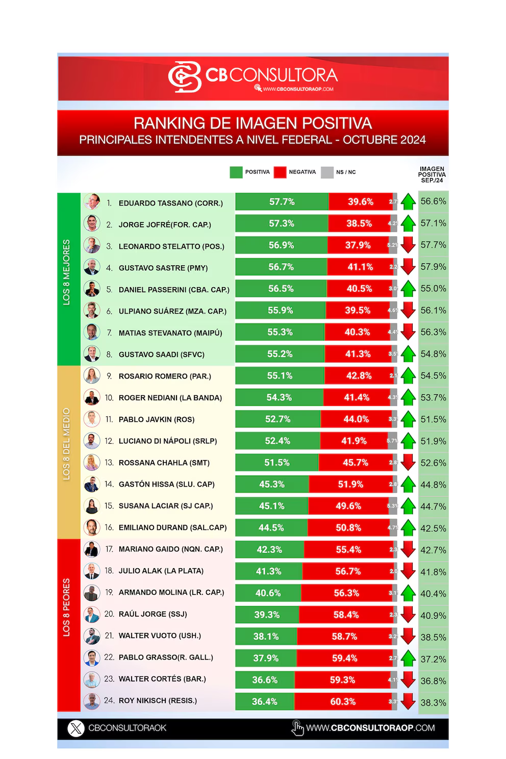 Por su parte, el podio de los intendentes mejores valorados del mes de octubre resultaron ser Eduardo Tassano, de Corrientes capital, con el 57,7% de aprobación, seguido por Jorge Jofré (ciudad de Formosa) y Leonardo Stelatto de Posadas con 56,9% de imagen positiva.