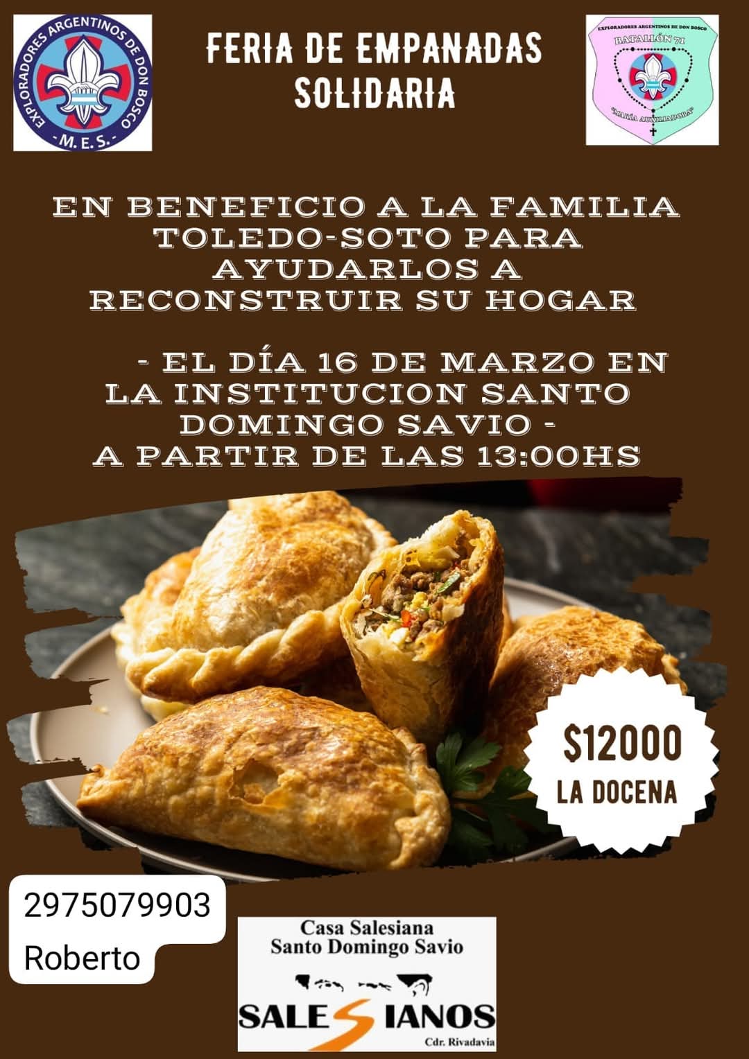 Los jóvenes del Batallón 71 de exploradores, junto con la Casa Santo Domingo Savio, está organizando una feria de empanadas para ayudar a la familia Toledo Soto, quienes lamentablemente perdieron su casa en un incendio en el barrio Ceferino.