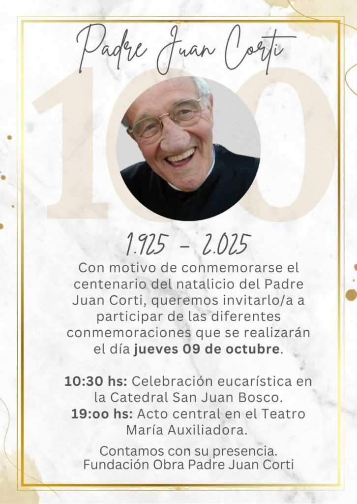 Posteriormente, el acto central se realizará a las 19:00 horas en el Teatro María Auxiliadora. La Fundación Obra Padre Juan Corti cuenta con la presencia de todos aquellos que deseen sumarse a recordar y honrar el legado del sacerdote en su 100° aniversario.