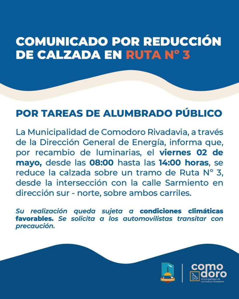 La Municipalidad de Comodoro Rivadavia, a través de la Dirección General de Energía, informa que, por recambio de luminarias, el viernes 02 de mayo, desde las 08:00 hasta las 14:00 horas, se reduce la calzada sobre un tramo de Ruta Nº 3.