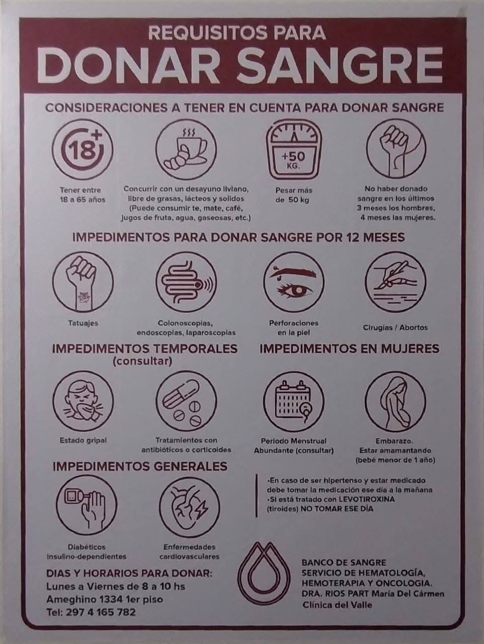 Las personas que puedan colaborar deben dirigirse al Banco de Sangre y Hemoterapia de la Clínica del Valle, ubicada en calle Ameghino Nº 1.334 (casi Avenida Alsina), de lunes a viernes de 8:00 a 10:00 horas.