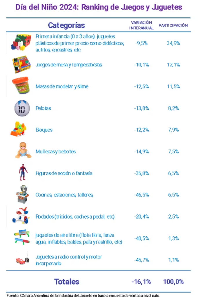 En el caso de las jugueterías más chicas, la Cámara Argentina de la Industria del Juguete reportó que en los negocios de barrio la venta promedió en $9.000, mientras que el monto ascendió a $25.000 en las cadenas de jugueterías. Incluso, remarcaron que el desempeño en las cadenas fue mejor, puesto que solo sufrieron una caída del 3%. No así en los barrios, donde la cifra escaló hasta el 19%.