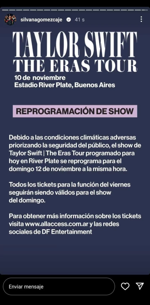 “Debido a las condiciones climáticas adversas, priorizando la seguridad del público, el show de Taylor Swift The Eras Tour, programado para hoy en River Plate se reprograma para el domingo 12 de noviembre a la misma hora”, reza el comunicado.