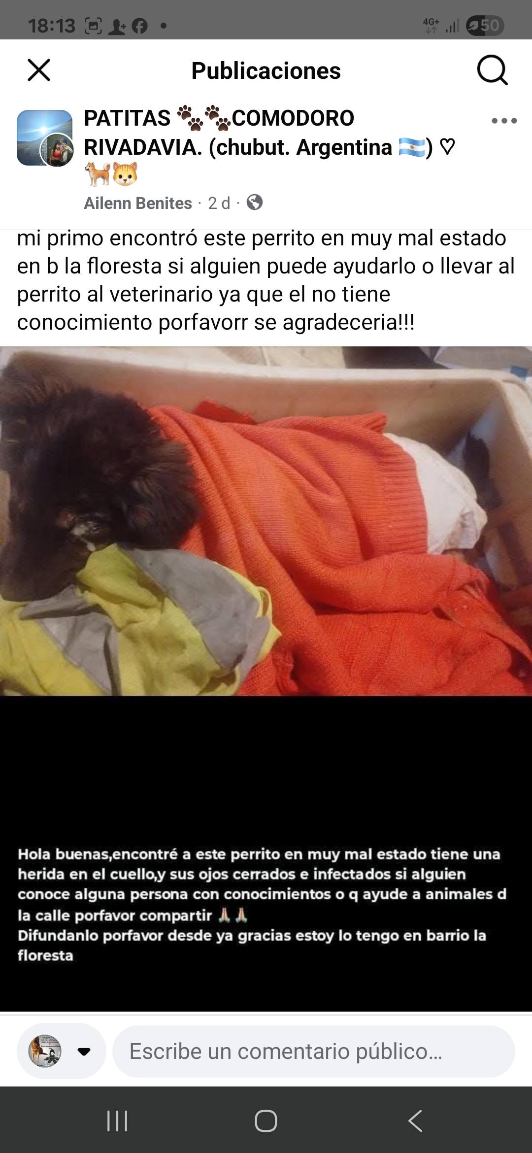 Un cachorro que había sido publicado en redes sociales días atrás en pedido de ayuda finalmente fue asistido y trasladado a la Veterinaria Roca, donde permanece bajo atención profesional.