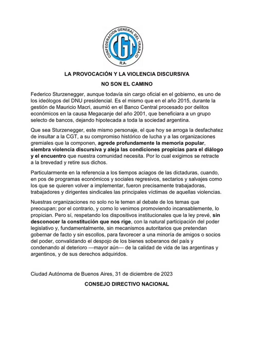“Este mismo personaje, el que hoy se arroga la desfachatez de insultar a la CGT, a su compromiso histórico de lucha y a las organizaciones gremiales que la componen, agrede profundamente la memoria popular, siembra violencia discursiva y aleja las condiciones propicias para el diálogo y el encuentro que nuestra comunidad necesita. Por lo cual exigimos se retracte a la brevedad y retire sus dichos”. “Particularmente en la referencia a los tiempos aciagos de las dictaduras, cuando, en pos de programas económicos y sociales regresivos, sectarios y salvajes como los que se quieren volver a implementar, fueron precisamente trabajadoras, trabajadores y dirigentes sindicales las principales víctimas de aquellas violencias. Nuestras organizaciones no solo no le temen al debate de los temas que preocupan; por el contrario, y como lo venimos promoviendo incansablemente, los propician”, señaló la CGT.