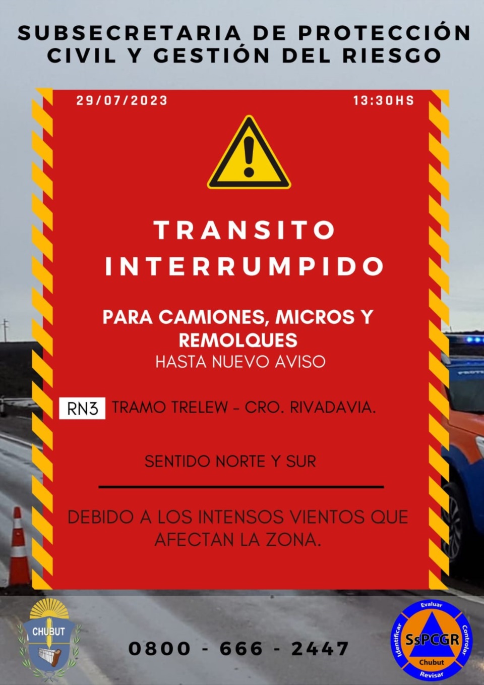 Debido a los intensos vientos que azotan la zona, la Subsecretaría de Protección Civil de la provincia restringió la circulación de vehículos en la Ruta nacional N°3.